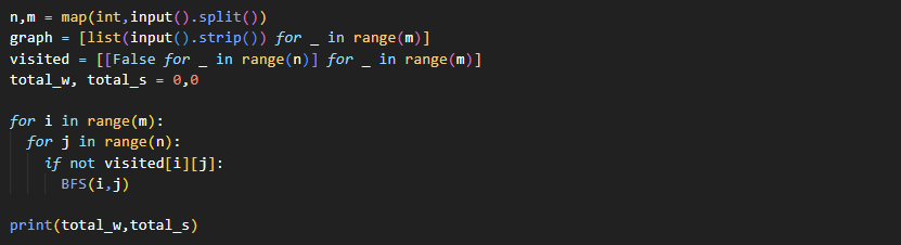 ★ BFS가 종료되었을 경우에 n명이 모이면 n**2의 위력을 낼 수 있기에 'total_w,' 'total_s' 변수에 white, blue를 제곱한 값을 더해줍니다 !