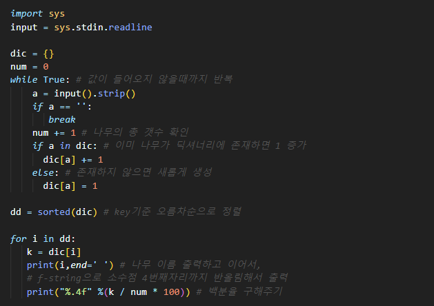 프로그램은 여러 줄로 이루어져 있으며, 한 줄에 하나의 나무 종 이름이 주어진다. 어떤 종 이름도 30글자를 넘지 않으며, 입력에는 최대 10,000개의 종이 주어지고 최대 1,000,000그루의 나무가 주어