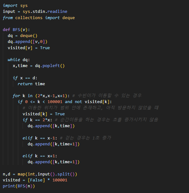 수빈이는 동생과 숨바꼭질을 하고 있다. 수빈이는 현재 점 N(0 ≤ N ≤ 100,000)에 있고, 동생은 점 K(0 ≤ K ≤ 100,000)에 있다. 수빈이는 걷거나 순간이동을 할 수 있다. 만약, 수빈이의 위치가 X일 때