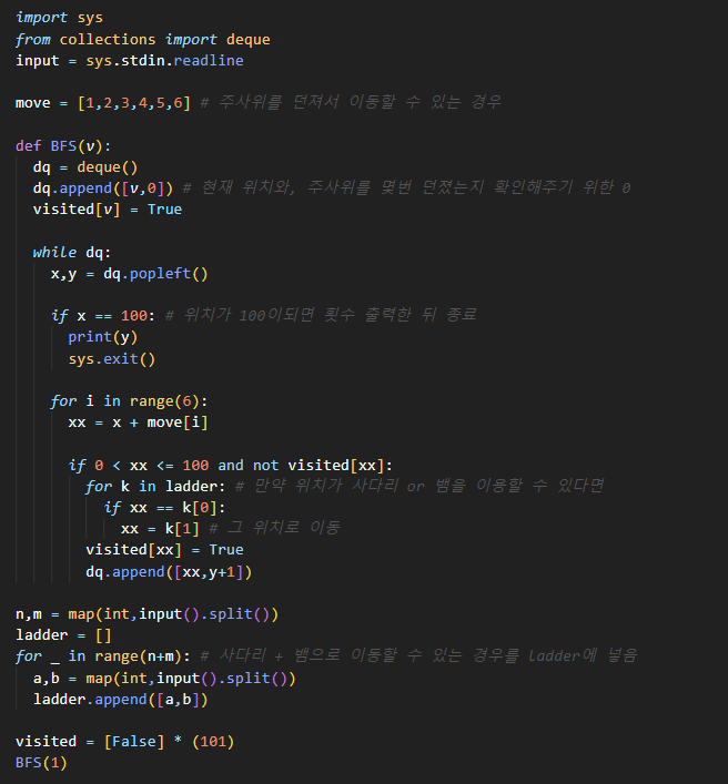 ★ 위의 원리를 파악했다면 visited 배열을 통해 이동한 칸들을 체크하여 중복으로 방문하지 않도록 합니다. 또한 결과값으로 주사위를 던진 횟수를 출력해야 하기 때문에 queue에 추가할 때마다 변수 y를 1씩 증가시켜 주사위 던진 횟수를 카운팅 해줍니다 !