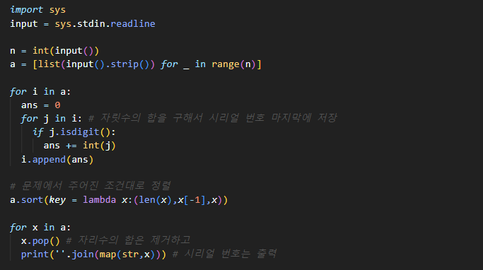 ★ 2번 조건의 경우에는 내장함수로 정렬할 수 없기에 직접 확인해줘야 합니다 ! 저는 주어진 시리얼 번호를 읽으면서 자릿수의 숫자일 경우 그 합을 시리얼 번호의 마지막에 추가해줬습니다. 이를 사용해 lambda 안에서 정렬을 해줍니다.