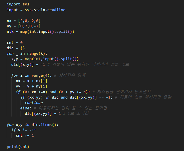 ★ 마지막으로 딕셔너리를 이용한 풀이를 시도했습니다. 기물이 갈 수 있는 위치를 찾는 방법은 똑같습니다. 상하좌우로 2칸씩 이동하면서 체스판을 벗어나지 않는다면 일단 다바바가 갈 수 있는 위치입니다. 이 때 이미 기물이 존재하는 곳은 가지 못하기 때문에 입력으로 기물의 위치를 받을 때 그 위치를 -1로 체크해뒀습니다.