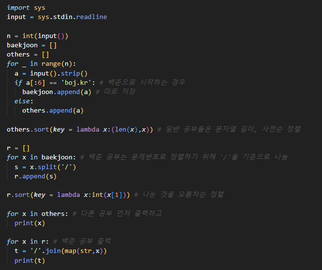 ★ 문제의 전체적인 아이디어는 백준 공부와 다른 공부를 나눠서 정렬한 뒤, 출력하는 것입니다. 백준 문제같은 경우에는 문제 번호를 오름차순으로 출력하고 다른 공부는 문자열의 길이대로, 같을 경우 사전순으로 정렬해서 출력합니다.