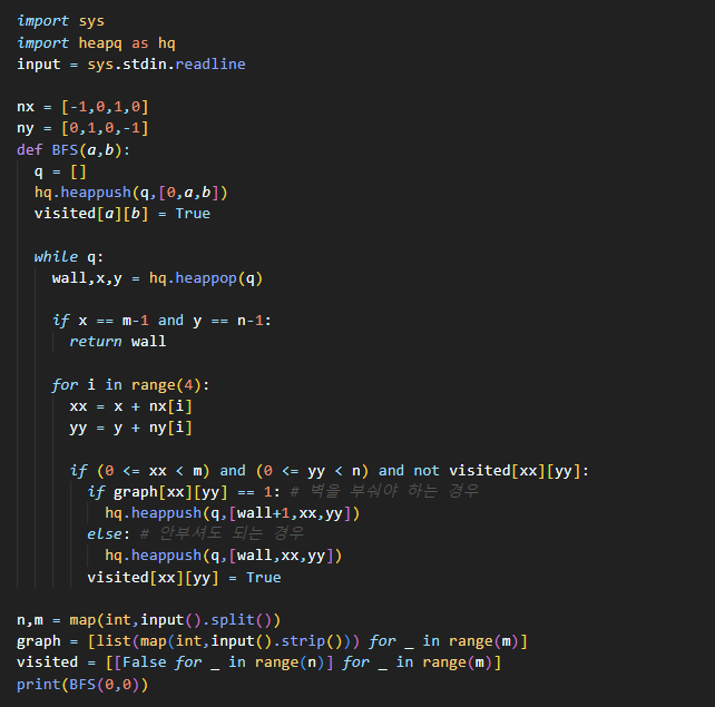 ★ 벽을 부숴야 하는 경우, 최소로 부수면서 목표지점에 도달해야 하기 때 힙 큐 안에 벽을 깬 횟수를 기준으로 최소정렬을 해줍니다 ! 그럴 경우 벽을 깬 경우는, wall 변수에 1씩 추가해주고, 깨지 않은 경우는 wall을 그대로 큐에 넣어줍니다. 이렇게 되면, 벽을 깬 횟수가 작은 좌표부터 상하좌우 탐색을 하게 되고 목표지점까지 도달할 수 있는지 확인하게 됩니다 :)