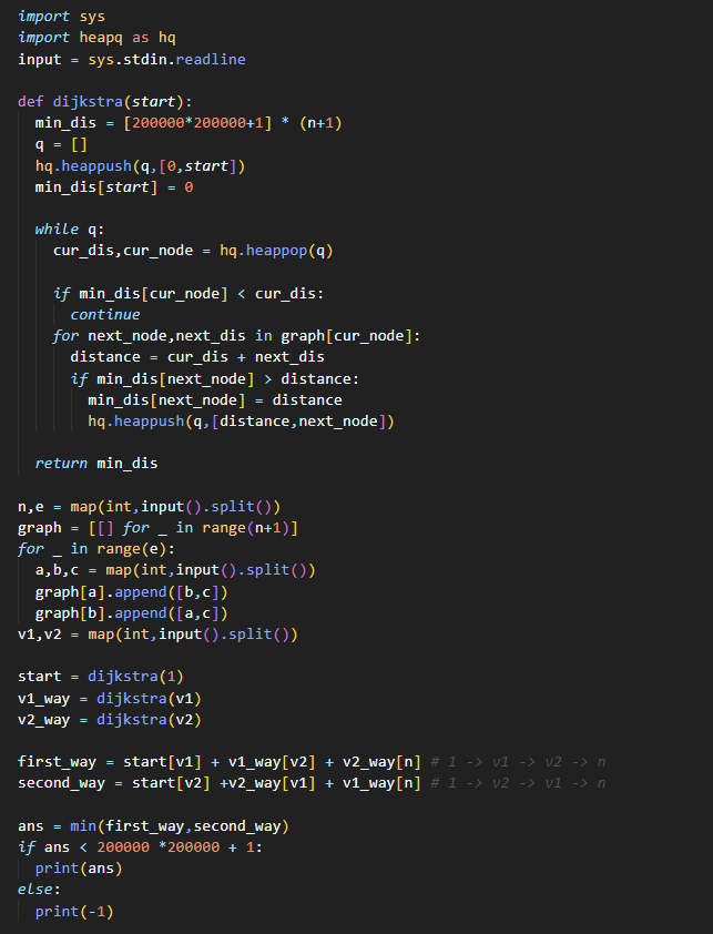 ★ 주어진 두 정점을 반드시 거치면서 최단 경로로 이동해야 하기 때문에 1부터 n까지 이동할 수 있는 방법은 총 두가지입니다.