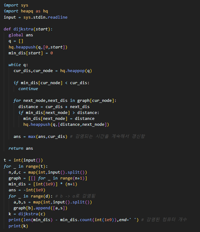 ★ 기존에 min_dis 배열을 int(1e9)로 초기화 해뒀기 때문에 감염되지 않은 컴퓨터들은 int(1e9)가 값이고, 감염된 컴퓨터들은 감염된 시간으로 값이 변경되어 있습니다. 그렇기에 min_dis 전체길이에서 int(1e9)의 개수를 뺀 값을 감염된 컴퓨터 갯수로 출력하였습니다.