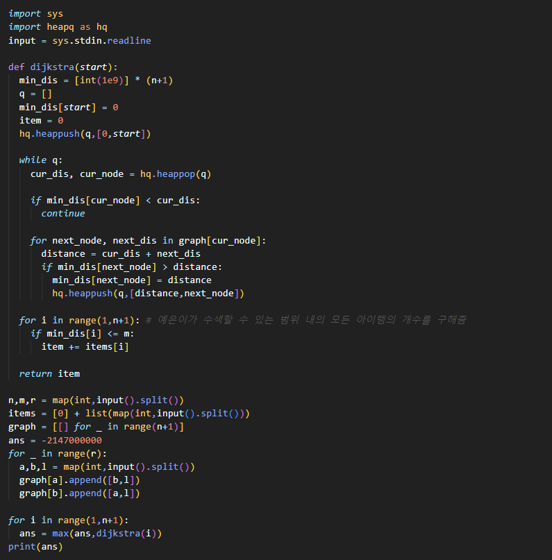 ★ 다익스트라를 통해 예은이가 떨어진 위치에서 수색할 수 있는 범위를 찾아줍니다. 그 후 그 범위 안에 있는 위치들이 가지고 있는 아이템의 개수의 합을 구해주면 됩니당 :)