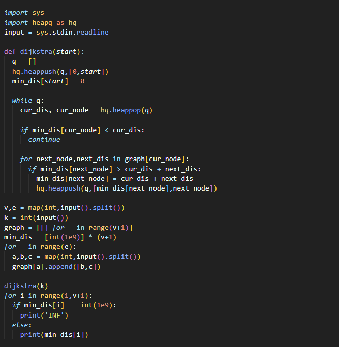 첫째 줄에 정점의 개수 V와 간선의 개수 E가 주어진다. (1 ≤ V ≤ 20,000, 1 ≤ E ≤ 300,000) 모든 정점에는 1부터 V까지 번호가 매겨져 있다고 가정한다. 둘째 줄에는 시작 정점의 번호 K(1 ≤ K ≤ V)가