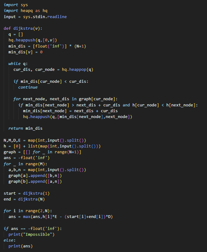 첫 번째 줄에 지도에 표시된 지점의 개수, 지점을 잇는 경로의 개수, 주환이의 거리 비례 체력 소모량, 높이 비례 성취감 획득량을 나타내는 정수 N, M, D, E가 공백을 사이에 두고 주어진다. (2 ≤