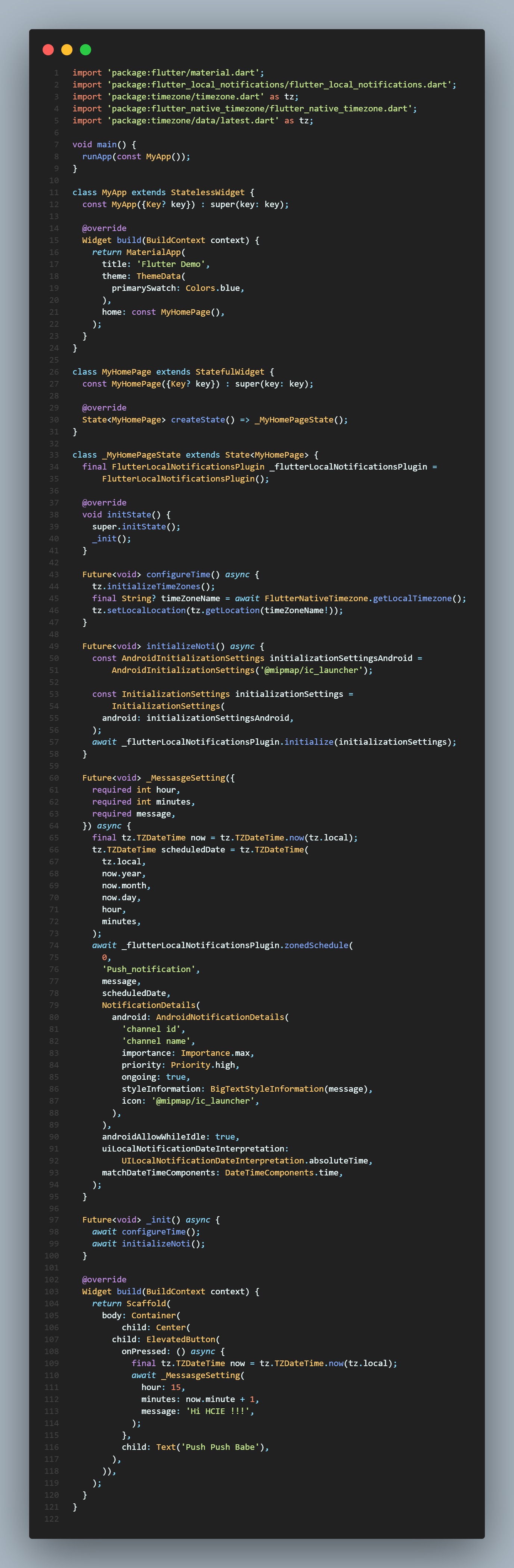 서비스를 개발하면서 푸쉬 알림 기능이 필요하였습니다. 원래는 fcm(firebase cloud messaging)를 사용하려고 했는데, 구현하고자 하는 기능이 단순히 미리 설정해둔 시간에 맞춰 알림이 오면 충분한 상황이라 flutter_local_notifications 패키지를 사용해서 구현해 보았습니다 !!