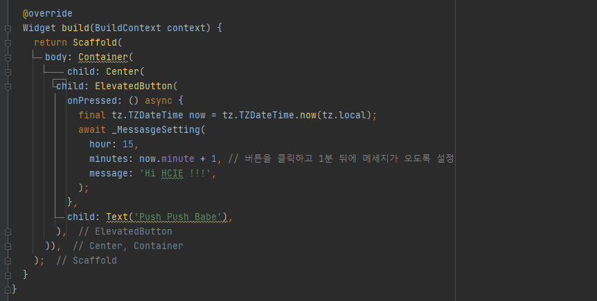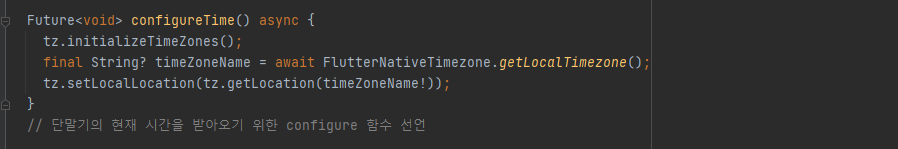 flutter_native_timezone 패키지를 추가하는 이유는 예약 메세지를 위한 현재 시간을 받아오기 위함입니다 :)