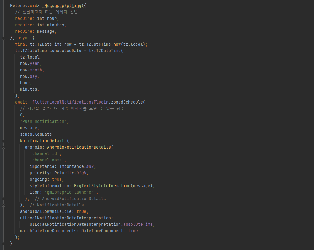 flutter_local_notification에는 notification을 줄 다양한 함수들이 있는데, 그 중 zonedSchedule는 예약 시간을 정해 그 시간에 메세지를 발송하는 데 사용할 수 있습니다 !!