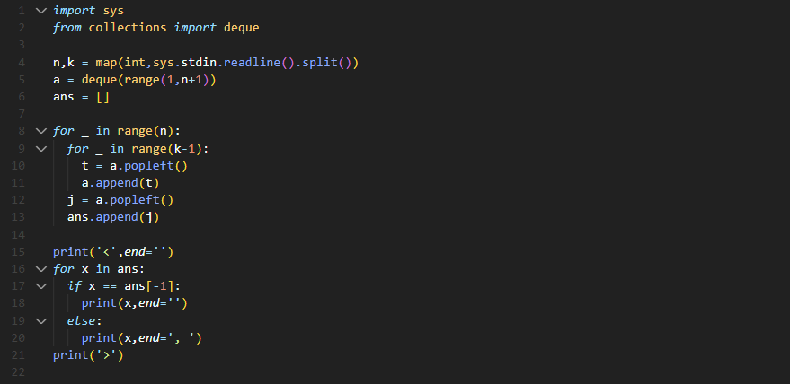 첫째 줄에 N과 K가 빈 칸을 사이에 두고 순서대로 주어진다. (1 ≤ K ≤ N ≤ 5,000)