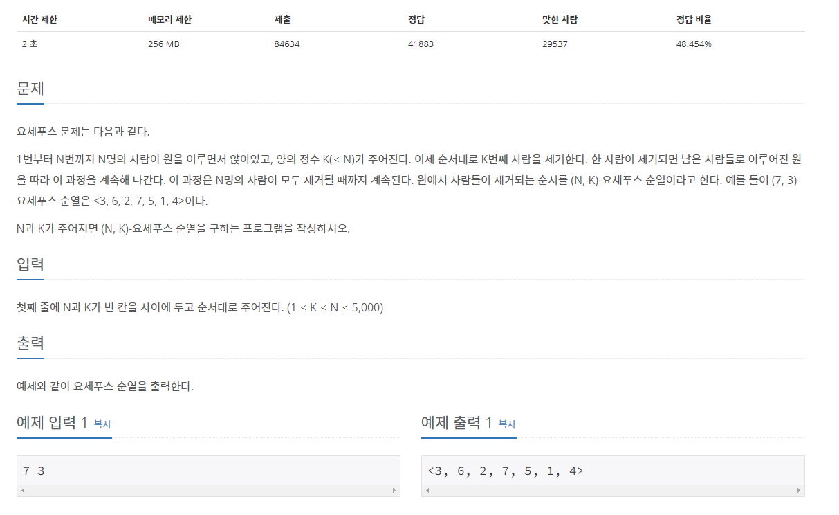 위와 같은 과정을 n 번 반복해주면 ans에 제거된 순서가 저장됩니다.