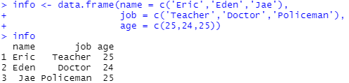 data.frame() : 서로 다른 유형의 vector가 사용되어도 괜찮지만, 길이는 같아야 합니다.