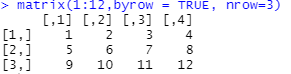 - byrow 인수는 행렬이 행에 의해 채워진다는 것을 말합니다. 만약 열로 채우길 원한다면 byrow = FALSE로 두시면 됩니다.(default)