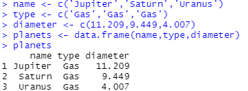 - method 2) data.frame(VariableName1 = c('values'), VariableName2 = c('values'))