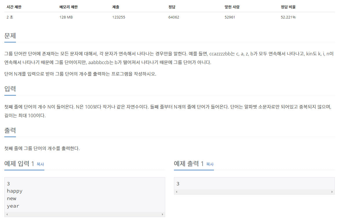 그룹 단어란 단어에 존재하는 모든 문자에 대해서, 각 문자가 연속해서 나타나는 경우만을 말한다. 예를 들면, ccazzzzbb는 c, a, z, b가 모두 연속해서 나타나고, kin도 k, i, n이 연속해서 나타나기 때