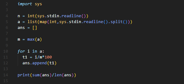 입력 받은 값에서 최대값을 찾아주고, 그 최대값으로 입력 값들을 하나씩 나눠준 뒤, 100을 곱해주면 되는 문제입니다 !