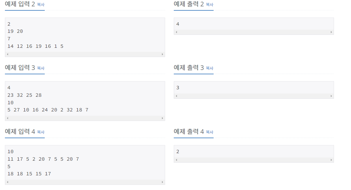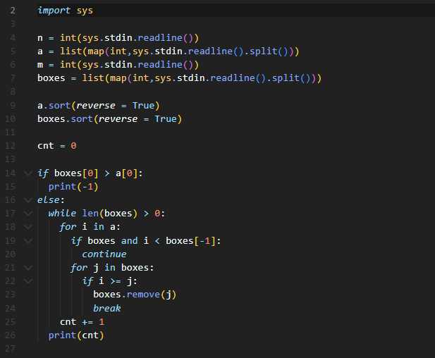 첫째 줄에 N이 주어진다. N은 50보다 작거나 같은 자연수이다. 둘째 줄에는 각 크레인의 무게 제한이 주어진다. 이 값은 1,000,000보다 작거나 같다. 셋째 줄에는 박스의 수 M이 주어진다. M은 10,000보