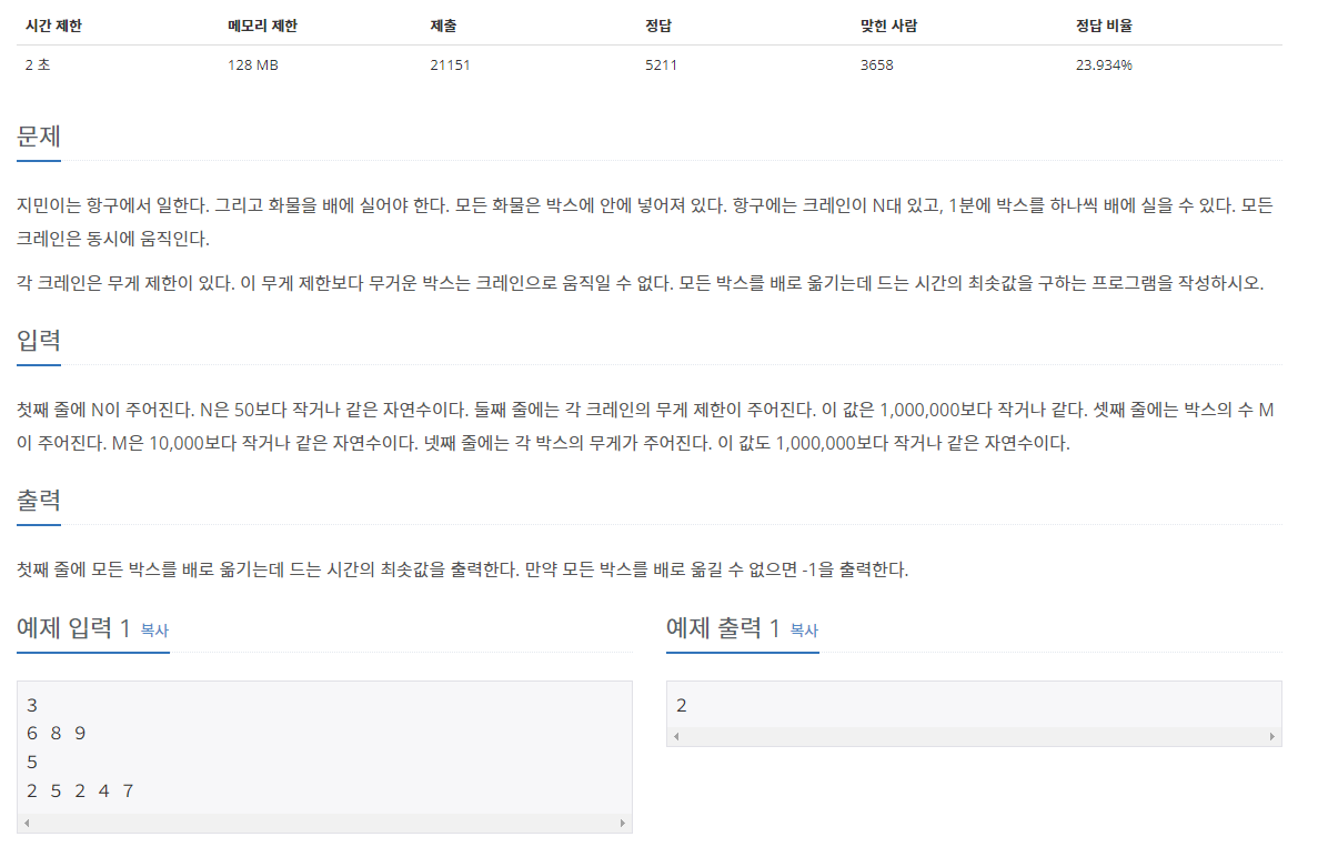 정답률은 낮지만 그렇게 어렵지 않은 문제입니다. 크레인으로 가장 무거운 무게부터 옮겨보고, 옮기지 못하면 시간을 출력해주면 됩니다 !