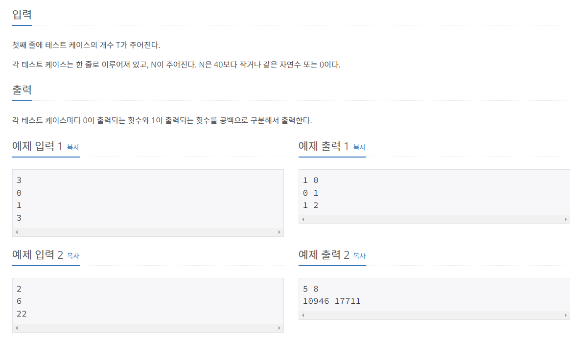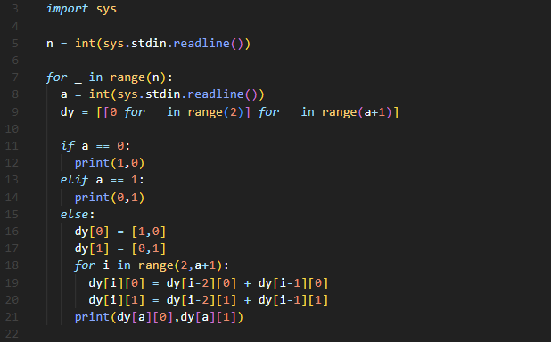 각 테스트 케이스마다 0이 출력되는 횟수와 1이 출력되는 횟수를 공백으로 구분해서 출력한다.