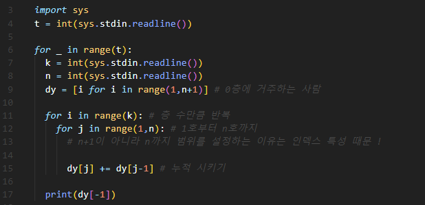 이러한 방식으로 코드로 구현하는데, 각 층의 해당 호수에 해당 호수 -1까지의 숫자를 계속해서 더해나가야 합니다.