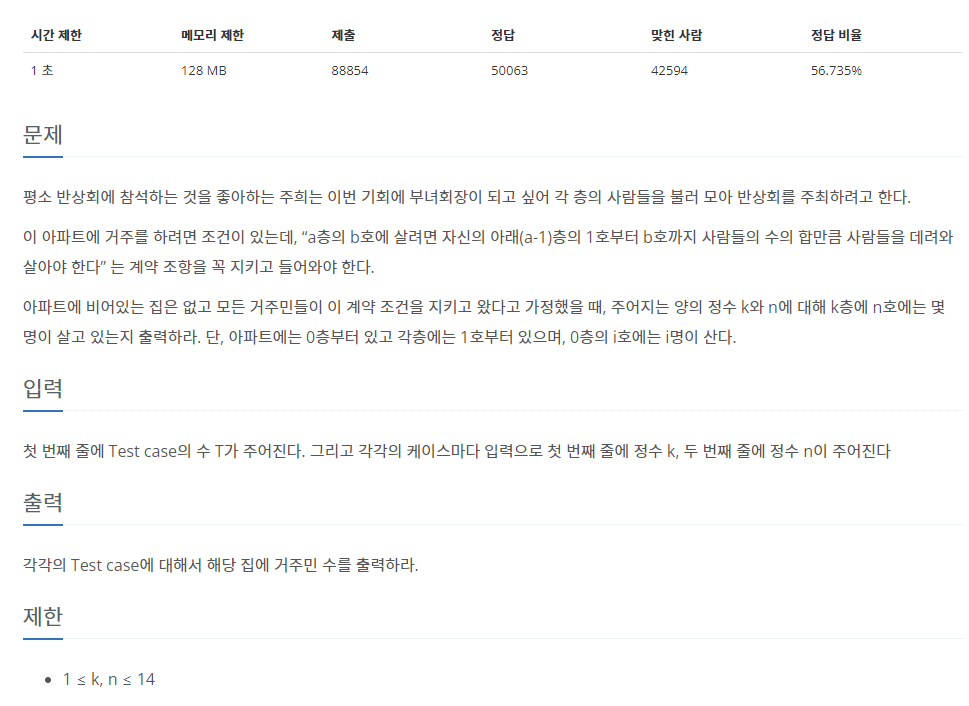 1층부터는 바로 아래층의 1호부터, 입력으로 주어지는 n호까지의 합의 사람이 해당 층 n호에 살고 있습니다.