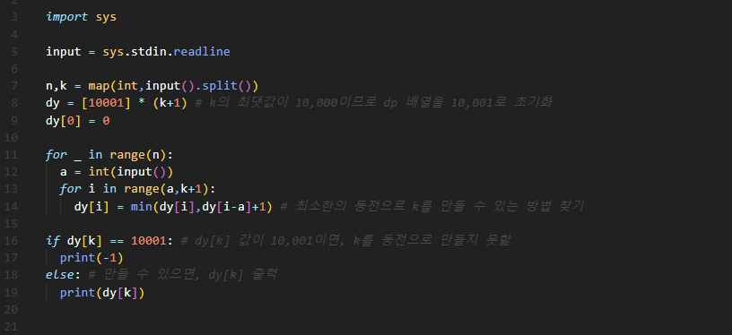 dy의 인덱스가 해당 동전으로 k를 만들기 위해 몇개의 동전이 필요한지를 보여줍니다 !