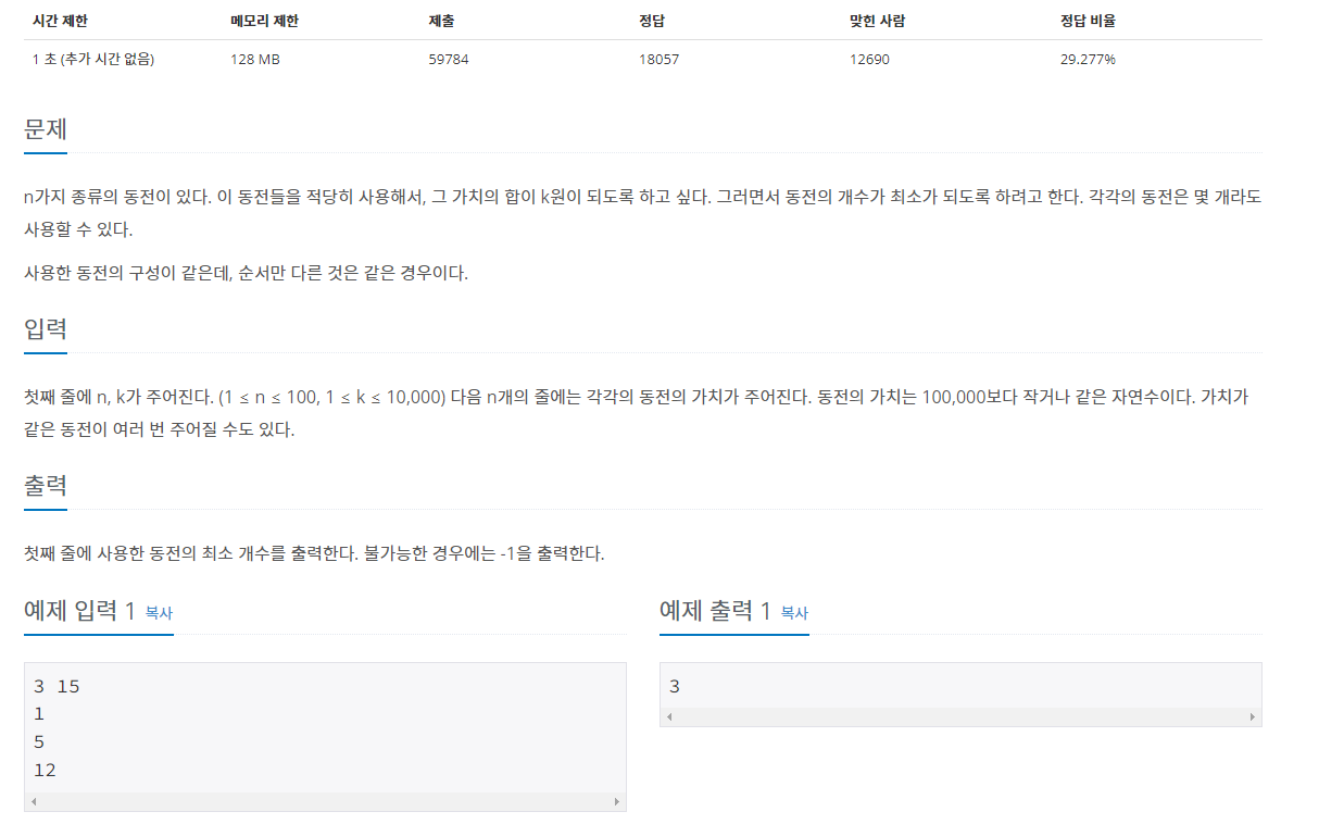 이러한 방식으로 일정 금액을 만들기 위해 주어진 동전이 몇개가 필요한지를 찾아나가며, 최솟값을 찾았을 때 최솟값이 기존 값이 아닌 새로운 값이 된다면 그 값에 +1을 해줘서 동전의 수를 하나씩 늘려줍니다 !