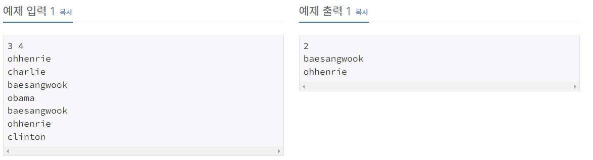 첫째 줄에 듣도 못한 사람의 수 N, 보도 못한 사람의 수 M이 주어진다. 이어서 둘째 줄부터 N개의 줄에 걸쳐 듣도 못한 사람의 이름과, N+2째 줄부터 보도 못한 사람의 이름이 순서대로 주어진다. 이름은 띄어쓰기 없이 알파벳 소문자로만 이루어지며, 그 길이는 20 이하이다. N, M은 500,000 이하의 자연수이다.