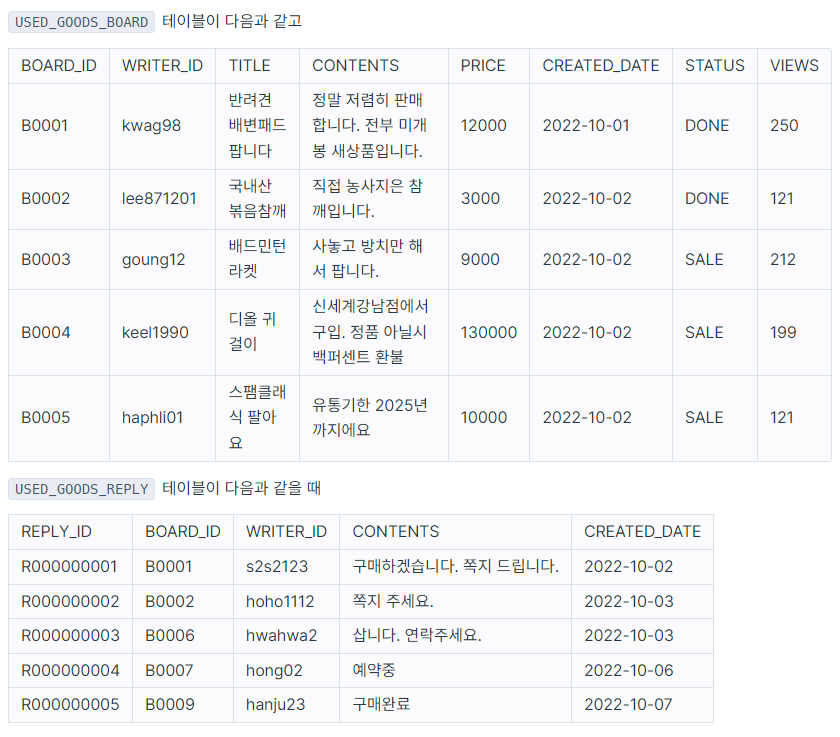 다음은 중고거래 게시판 정보를 담은 USED_GOODS_BOARD 테이블과 중고거래 게시판 첨부파일 정보를 담은 USED_GOODS_REPLY 테이블입니다. USED_GOODS_BOARD 테이블은 다음과 같으며 BOARD_ID, WRITER_ID, TITLE, CONTENTS, PRICE, CREATED_DATE, STATUS, VIEWS은 게시글 ID, 작성자 ID, 게시글 제목, 게시글 내용, 가격, 작성일, 거래상태, 조회수를 의미합니다.