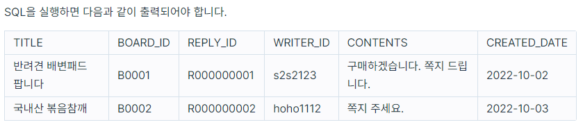 SELECT B.TITLE, B.BOARD_ID, R.REPLY_ID, R.WRITER_ID, R.CONTENTS,