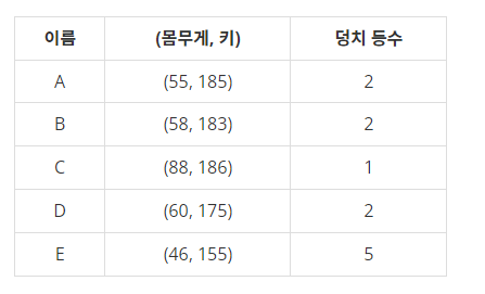 N명의 집단에서 각 사람의 덩치 등수는 자신보다 더 "큰 덩치"의 사람의 수로 정해진다. 만일 자신보다 더 큰 덩치의 사람이 k명이라면 그 사람의 덩치 등수는 k+1이 된다. 이렇게 등수를 결정하면 같은 덩치 등수를 가진 사람은 여러 명도 가능하다. 아래는 5명으로 이루어진 집단에서 각 사람의 덩치와 그 등수가 표시된 표이다.