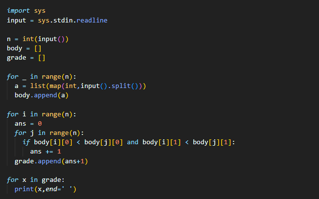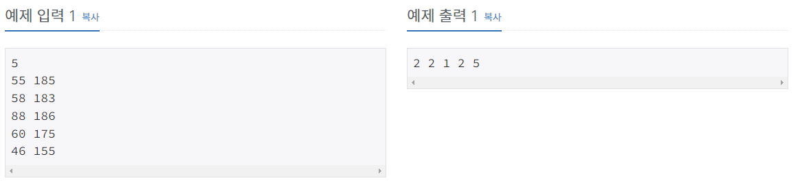 여러분은 입력에 나열된 사람의 덩치 등수를 구해서 그 순서대로 첫 줄에 출력해야 한다. 단, 각 덩치 등수는 공백문자로 분리되어야 한다.