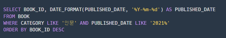 ★ WHERE절에서 CATEGORY가 '인문'이면서 PUBLUSHED_DATE가 2021로 시작하는 데이터만 추출