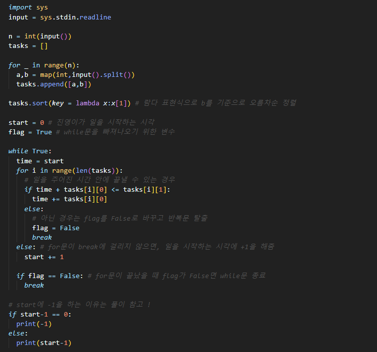 https://www.acmicpc.net/problem/2437 2437번: 저울 하나의 양팔 저울을 이용하여 물건의 무게를 측정하려고 한다. 이 저울의 양 팔의 끝에는 물건이나 추를 올려놓는 접시가 달려 있고, 양팔의 길이는 같다. 또한, 저울의 한쪽에는 저울추들만 놓 www.acmicpc.net 소스코드 풀이 ★ 처음 생각했던 방식은 최솟값을 구해야 하기에 입력 받은 저울 추를 오름차순 정렬하고, 저울추로 구할 수 있는 모든 경우의 수를 구한 뒤, 구하지 못하는 값들 중 최솟값을 출력하는 방식이었습니다 ! ex) [A,B,C] => A, A+B, A+C, B+C, A+B+C 하지만 당연하게도 시간초과가 발생했고, 입력 받은 예제를 토대로 위와 같은 방식을 출력해보니 다음과 같은 결과를 얻을 수 있었..