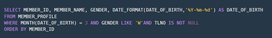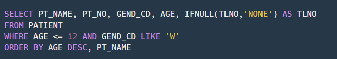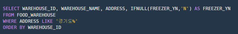https://school.programmers.co.kr/learn/courses/30/lessons/131114 프로그래머스 코드 중심의 개발자 채용. 스택 기반의 포지션 매칭. 프로그래머스의 개발자 맞춤형 프로필을 등록하고, 나와 기술 궁합이 잘 맞는 기업들을 매칭 받으세요. programmers.co.kr 소스코드 풀이 ★ IFNULL 구문을 사용하여 냉동여부(FREEZER_YN)가 NULL값일 때 'N'으로 변경하여 출력해줍니다. ★ 주소(ADDRESS)가 경기도인 것들만 추출해야 하기 때문에 주소의 시작이 '경기도'로 시작하는 값들만 찾아줍니다. ★ WAREHOUSE_ID를 기준으로 오름차순 정렬